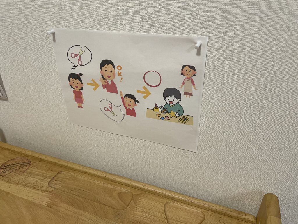 はさみを使うのが大好きな娘は、一人ではさみを使っていたことがありました。はさみを使う前に声をかけることを忘れないために、目に入る位置に掲示をするように工夫しています。