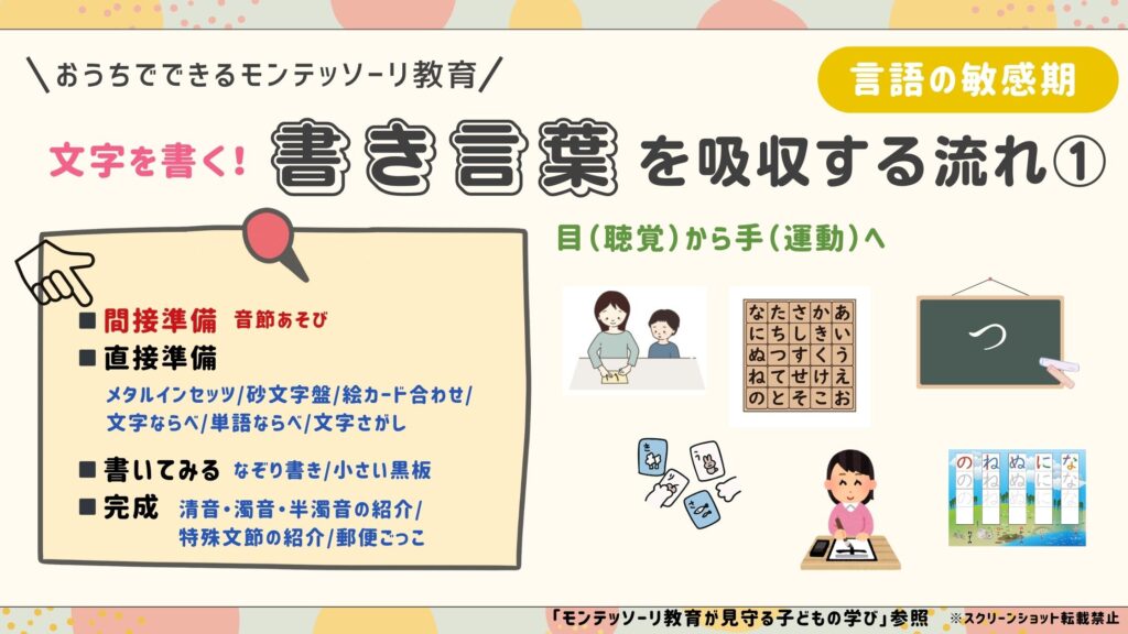 モンテッソーリ教育「言語の敏感期」については、こちらの記事↓をご参考ください。