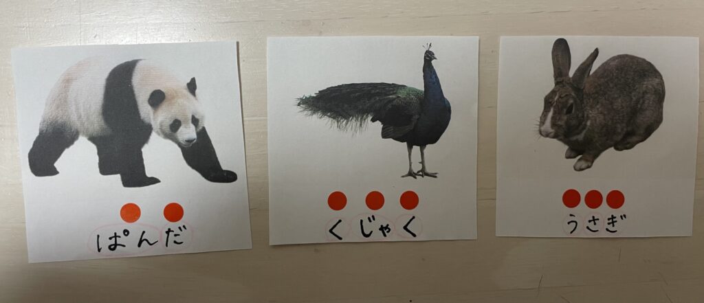 音と文字を一致させ特殊音節も理解するためには、絵カードと丸シールを使うことをおすすめします。