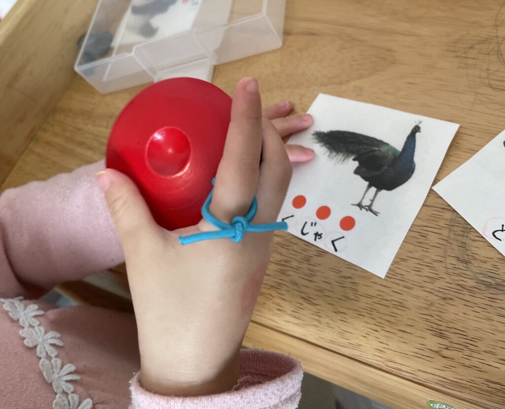 そして、(と言いながら)毎日楽しそうに取り組んでいます笑。カスタネットを鳴らすのが楽しいようで、カードにしていない「かえる」なども自分で言いながら3回鳴らせるようになりました。