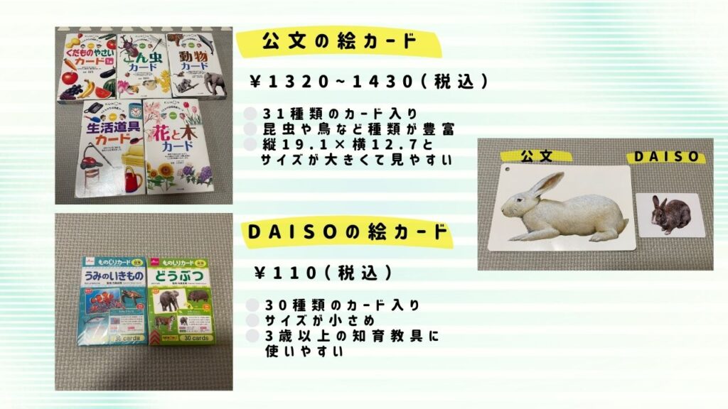 モンテッソーリ教育の教具は一つずつ大きいですが、手作り教具は「安さ&スペースの確保」を重視してDAISOのカードを使っています。