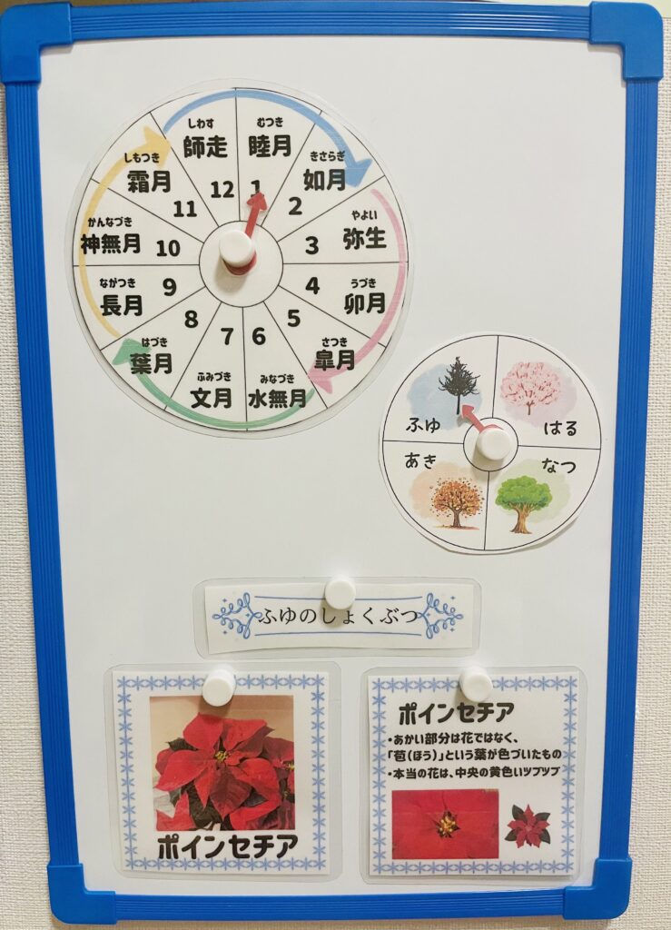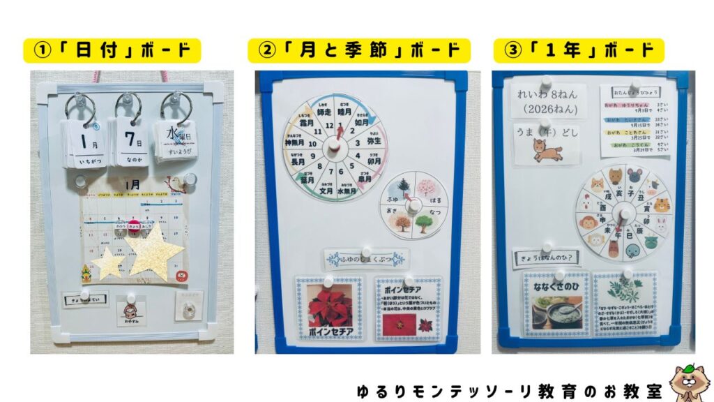 「日付」「月と季節」「1年」が理解できるように、3つのボードに分けています。