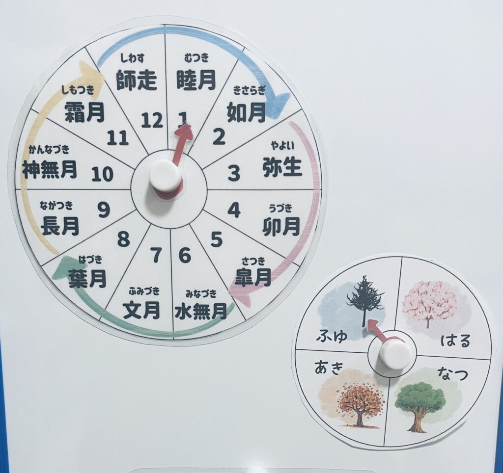 「日付」カレンダーは毎日、「月と季節」カレンダーは月毎に動かします。一方で、「年」カレンダーは「1年間、動かさない」ことが特徴であり、これが視覚的な学びとなります。