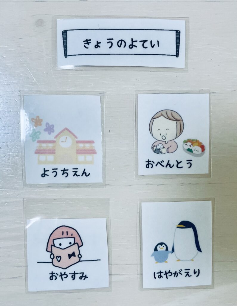 『今日の予定』は、絵を用いて視覚的にイメージしやすくなるようにしています。また、あまり種類が増えると混乱を招くと考え、ざっくりと「幼稚園」か「お休み」のどちらかを選択できるように工夫しています。