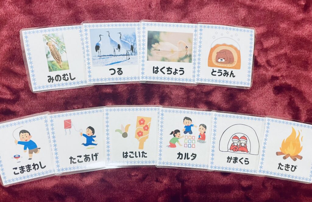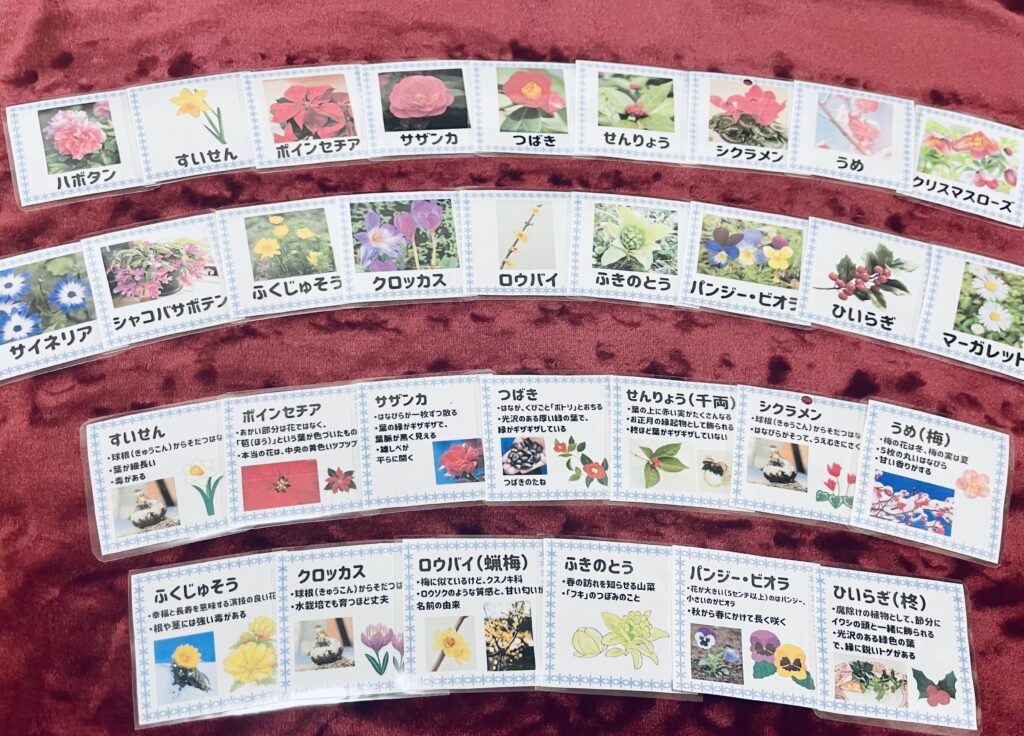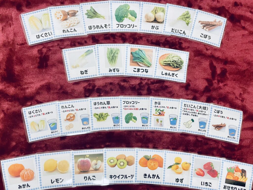 季節カードは小学校受験問題を参考に、こちらもCanvaで制作しました。カード毎に、その特徴や説明が書かれたカードも作成しています。(野菜であれば、野菜の断面と、どこにできてどの部位を食べ、水に浮くか沈むかも記載しています。)