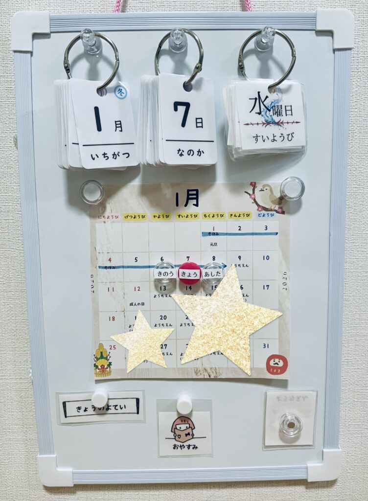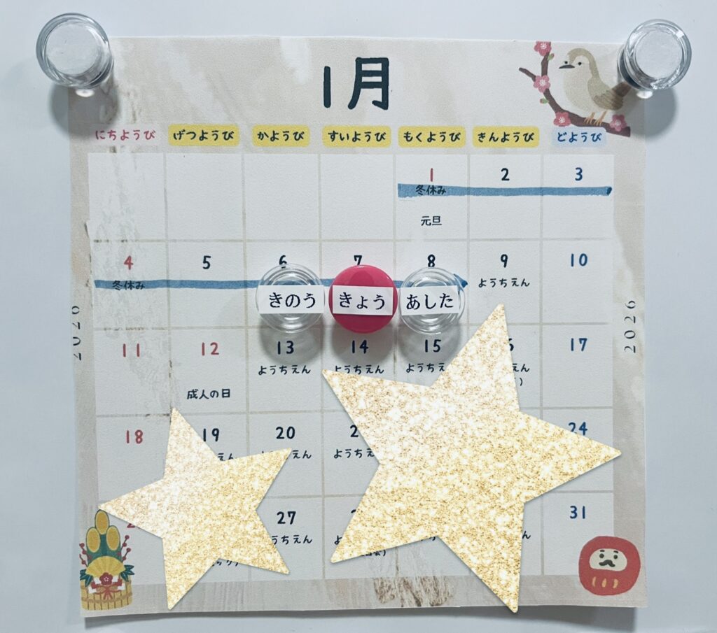 朝のルーティンとして取り入れやすくするために、今日の日付に〇をつけたり、シールやスタンプを付けるのもおすすめです。子どもの興味をグッと惹きますよ!