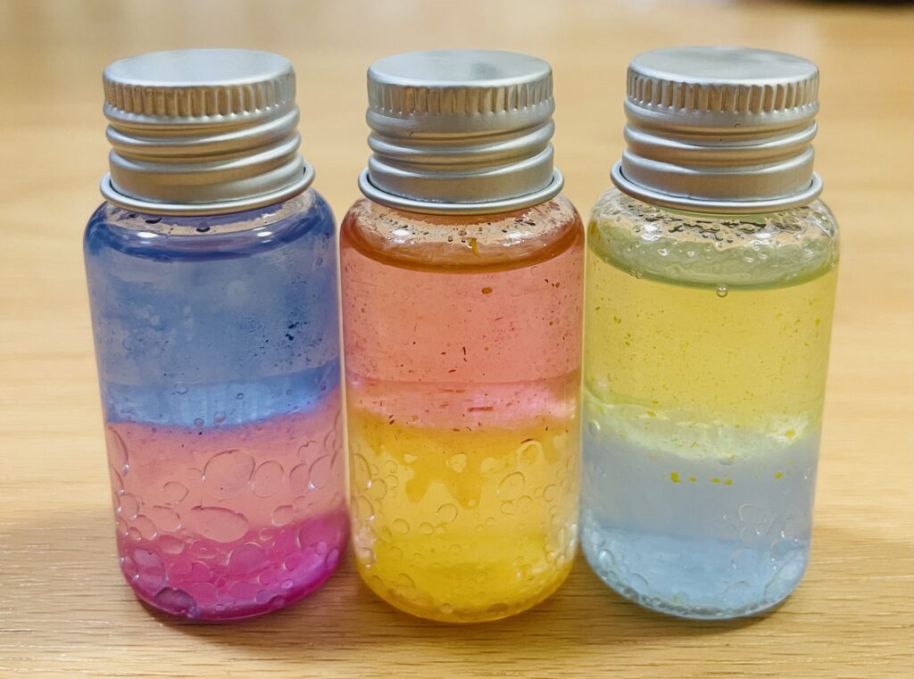 ボトルを振るだけで色が混ざり、色が変化する様子を観察できます。手指の巧緻性が未発達の時期でも取り組みやすい、感覚教具の一つになります。