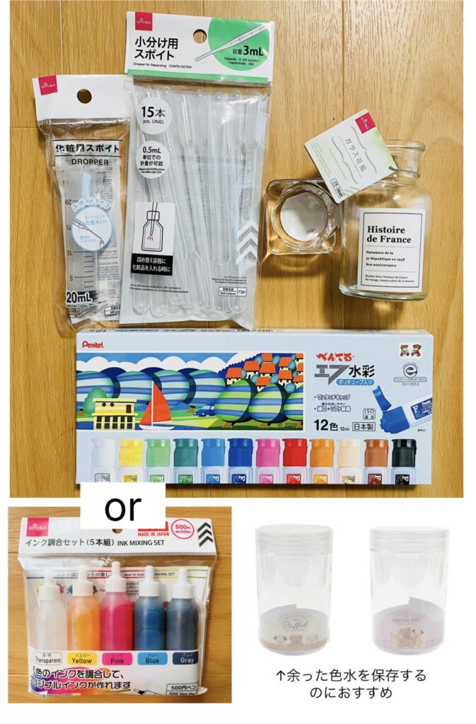 - 水性の絵の具(DAISOのインク調合セットもおすすめです)