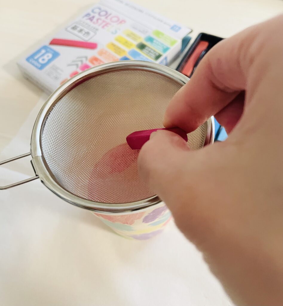 パステルクレヨンを茶漉しで削り、紙コップの水に入れて混ぜます。