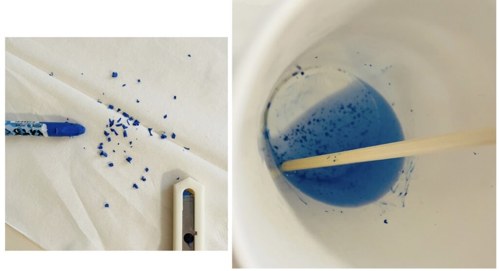 ぺんてるクレヨンをカッター(鉛筆削りでも可)で削り、温めたベビーオイルに入れます。このままだと色が出にくいので、混ぜながらクレヨンを潰していきます。