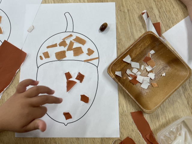のり貼りは、手先の器用さや目と手の連動、集中力を高めます。指先を“つぼめる”動きを獲得できるため、ファスナーやボタン留め、お箸の練習に繋がります。