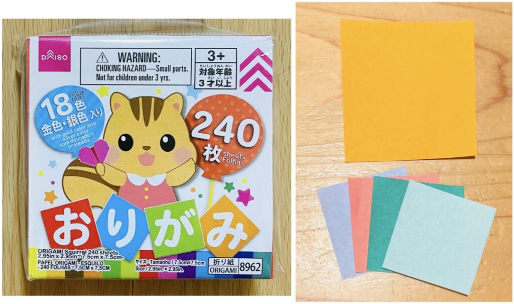 DAISOで購入した折り紙を、各サイズでカットして色紙を用意します。