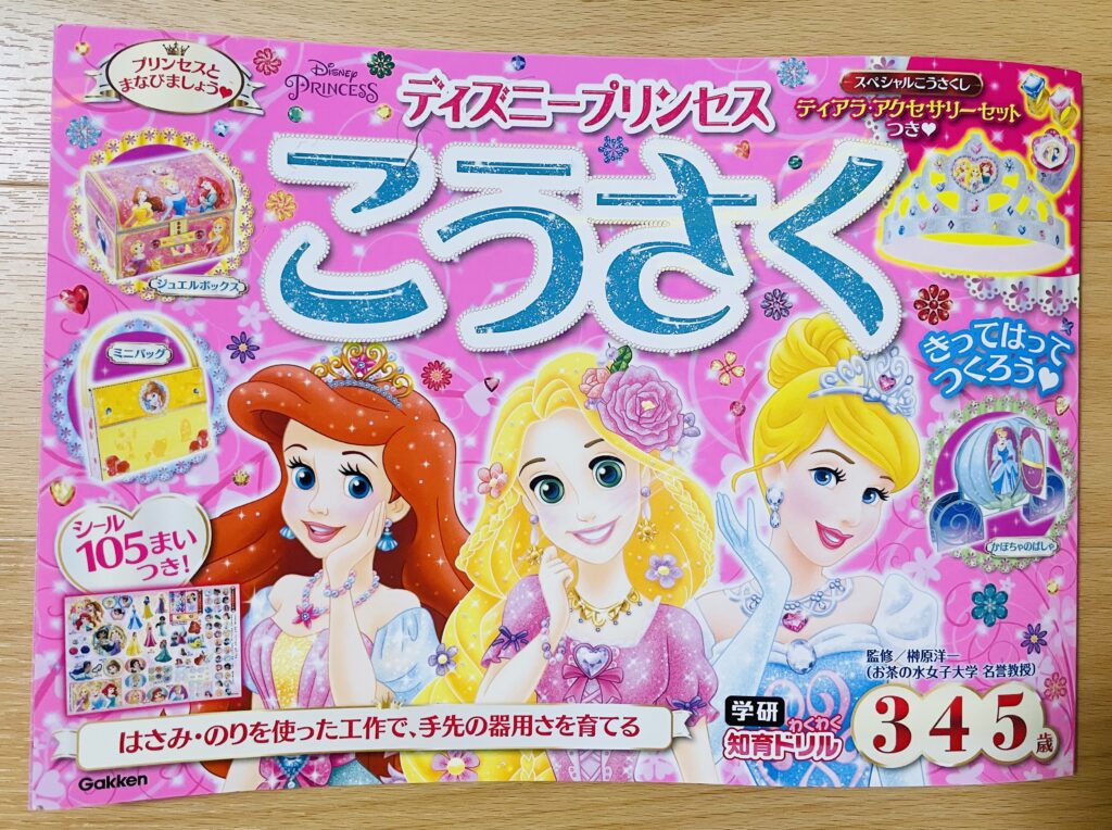少し邪道ではありますが・・・完成した作品が「可愛い」と、最後まで作業を続けることができます。娘はプリンセスにハマっているので、学研出版のディズニープリンセスの工作ドリルを用意しました。