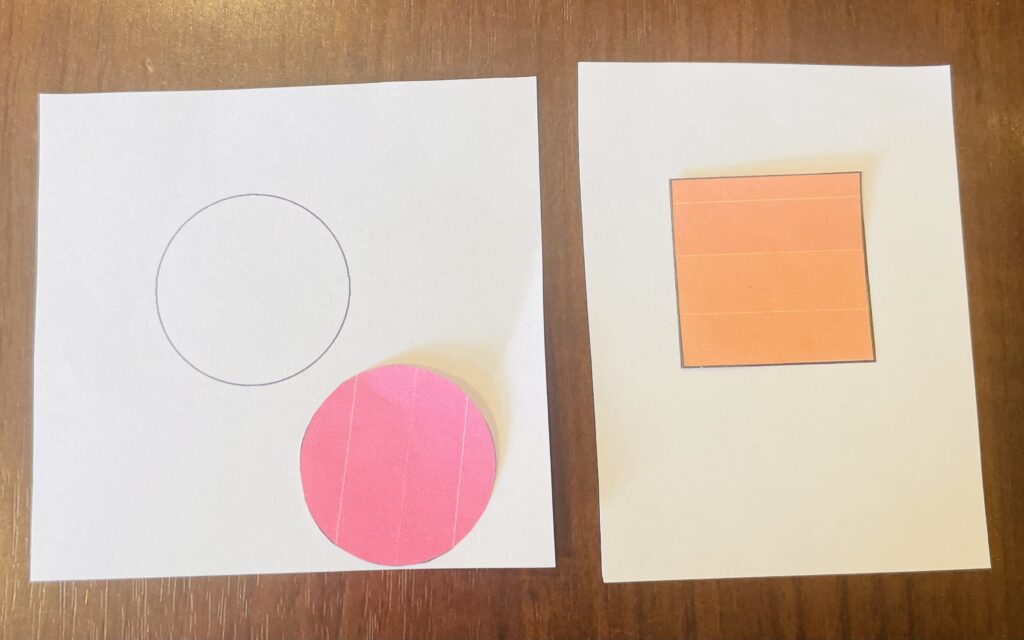 のりの使い方に慣れたら、形を選んで的に貼ってみましょう。最初は、丸だけ、四角だけ、と選択肢を狭めて進めることがおすすめです。