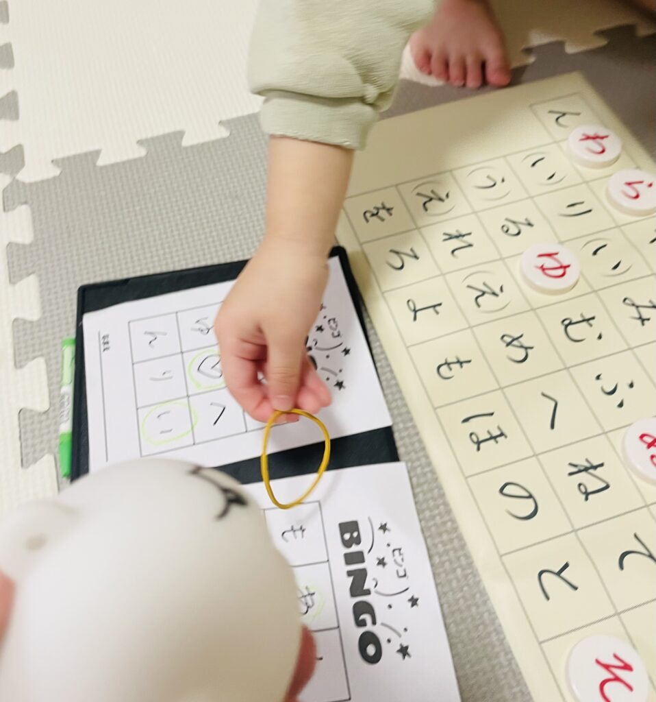 参加者たちは自分で文字を探せないので、私が代わりに「あれ?この文字同じかなぁ?」と小芝居を挟んで文字を指差すと、ビンゴカードの文字にも興味を持ちます。気がついたら「お姉さん役」も「参加者役」も交互になりきり、多くの文字に触れることができます。