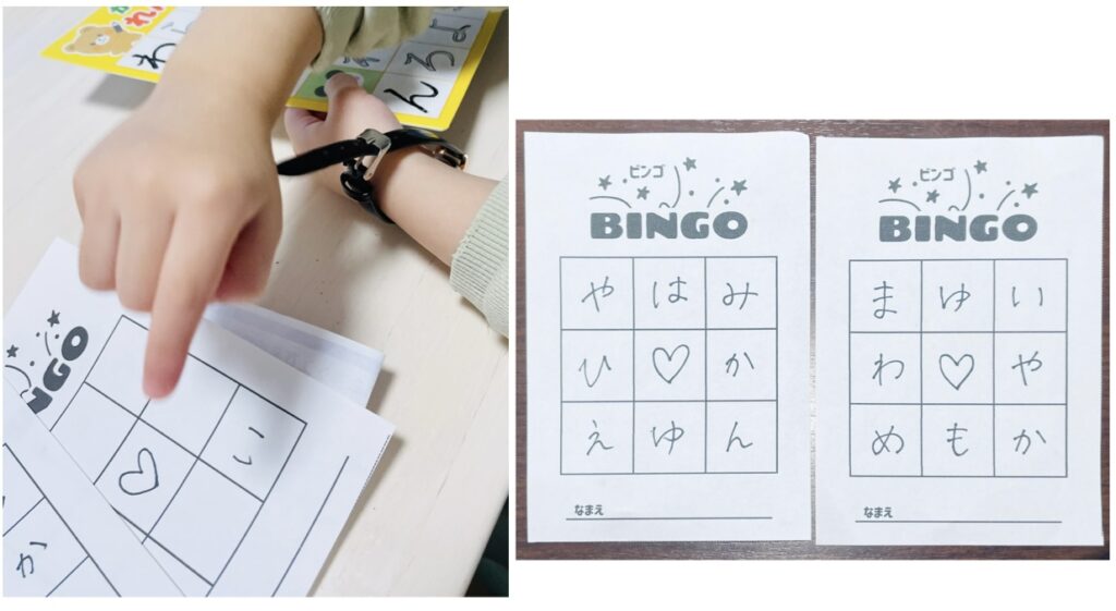 ひらがなビンゴとは、通常のビンゴゲームで使う「数字」を「ひらがな」に置き換えた知育遊びです。