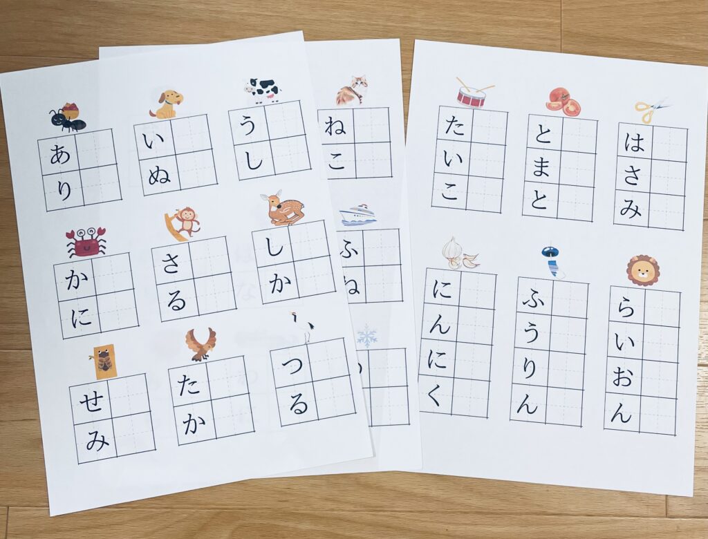 台紙はCanvaで作成しましたが、手書きでも準備できます。単語の絵を描くと、視覚的に読むことができます。濁音や半濁音、拗音などのない単語から始めてみてください。