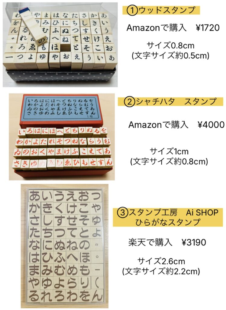 ネットで購入できる「ひらがなスタンプ」3種類を用意しました。