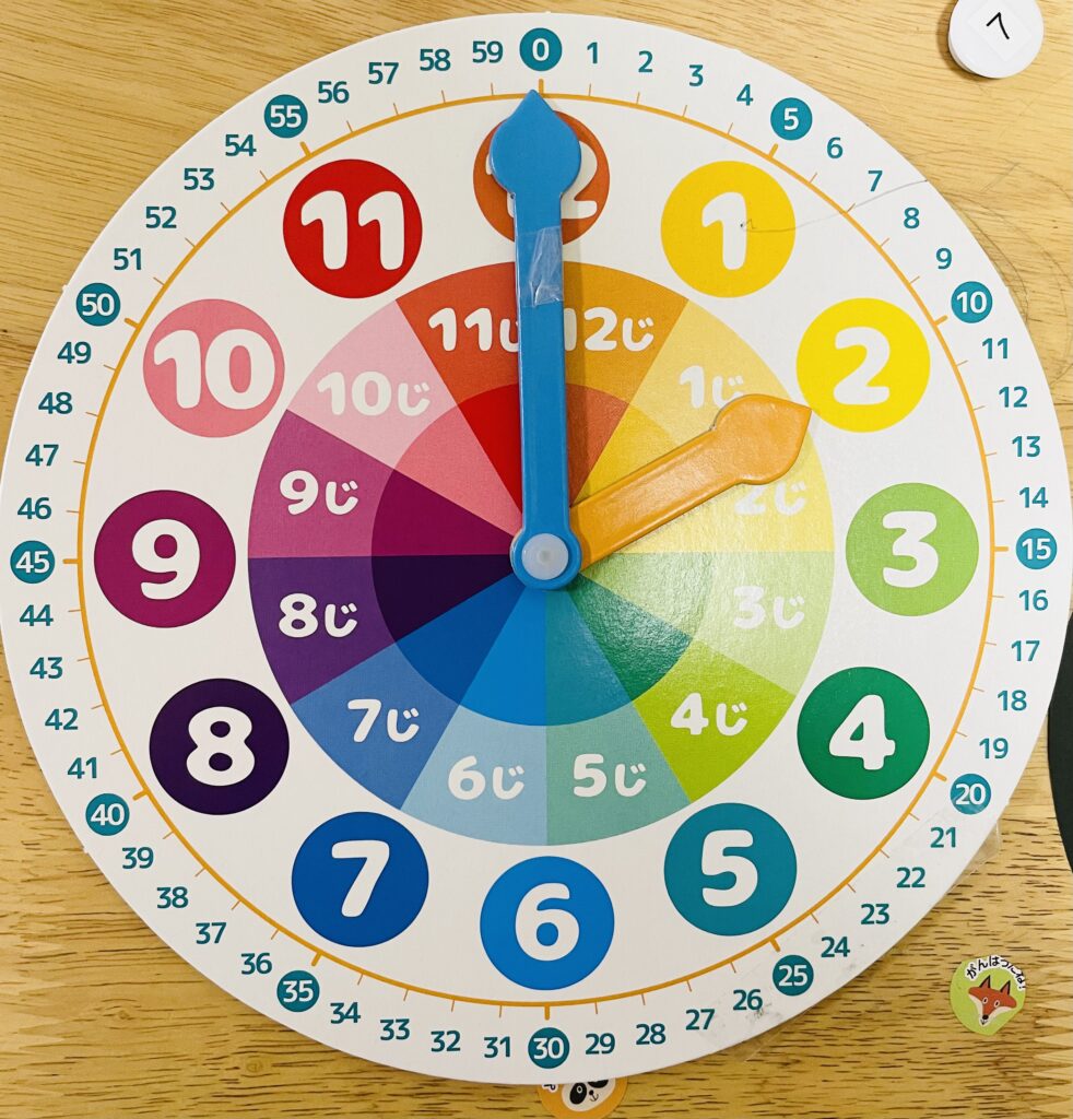 「時計の仕組み」は、大人にとっては当たり前に感じても、子どもにとっては新鮮なものです。針を自由に動かせる時計を使い、子ども自身が針を操作して「時」と「分」の違いや連動性を学びましょう。家では、DAISOの「がくしゅう時計」を使っています。