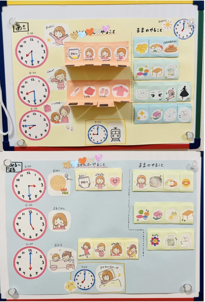 1日の流れを時計の絵と共に可視化し、日常生活と時間を結びつけることもおすすめです。「時刻表」を導入することで、時計を見る機会が自然と増え、時間を意識した習慣作りができます。